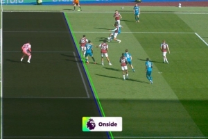 体育资讯4月5日讯 在本轮英超伯恩茅斯对阵西汉姆的比赛中,伯恩茅斯球员埃瓦尼尔森上半场率先破门。 英超官方也晒出埃瓦尼尔森进球VAR越位划线图,解释说明道:“主裁判认定进球有效的判罚经过VAR的检查和确认,埃瓦尼尔森并未处在越位位置。”
